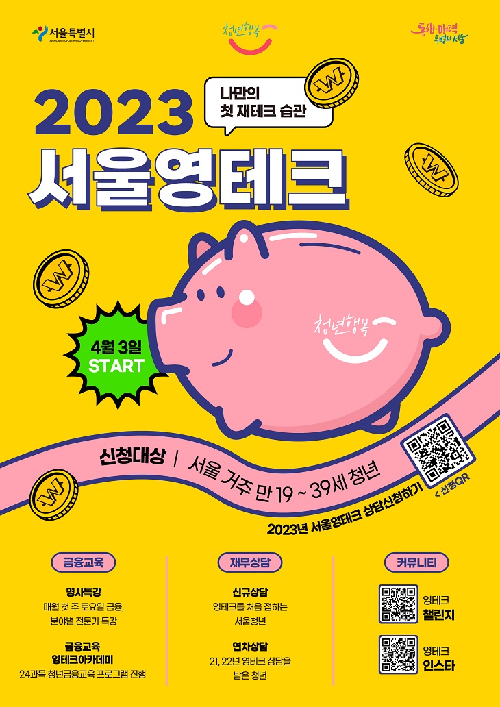 자산형성이 어려운 청년에게 쳬계적인 교육과 재무상담을 통해 경제적 자립을 지원하는 '서울영테크' 지원 사업 물론 상품분석 및 투자 조언은 분석을 해주는 것일 뿐 결과에 대한 책임 투자자에 있는 것이다. 그래도 금융 용어나 재무 영역이 생소한 청년들에게 무료 교육을 진행해 준다니 신청 받아서 삼당 받기를 추천한다.