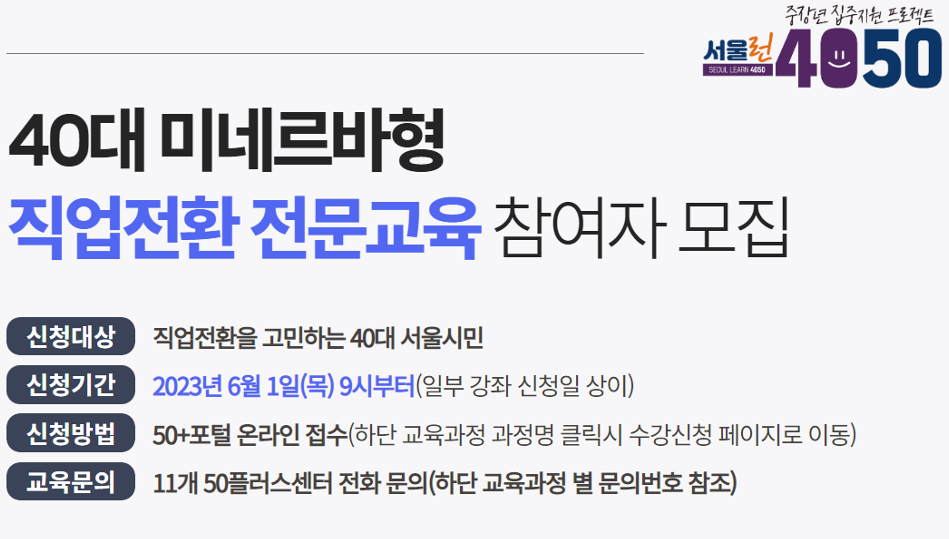 제2의 인생으로 전환하실 수 있습니다. 현재 '40대 미네르바형 직업전환 전문교육 참여자도 모집'하고 있으니 교육과정 확인하셔서 온라인 접수 하실 수 있습니다.