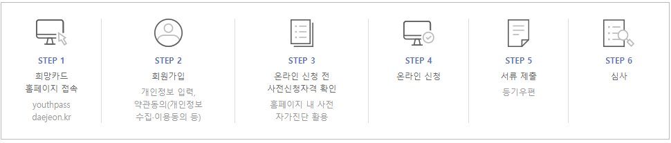 온라인신청 (희망카드 홈페이지) -> 서류 제출(등기우편) -> 접수완료